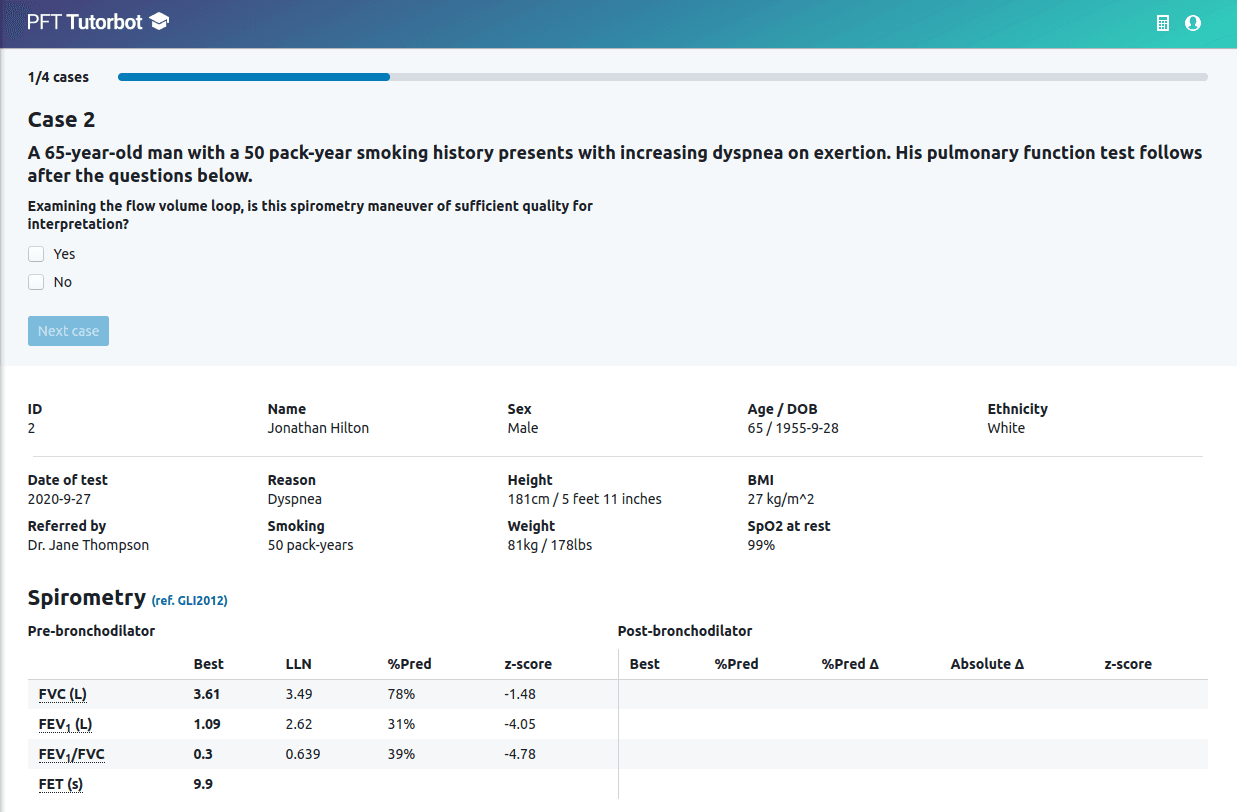 Test your knowledge of spirometry and diffusing capacity tests on realistic examples.
